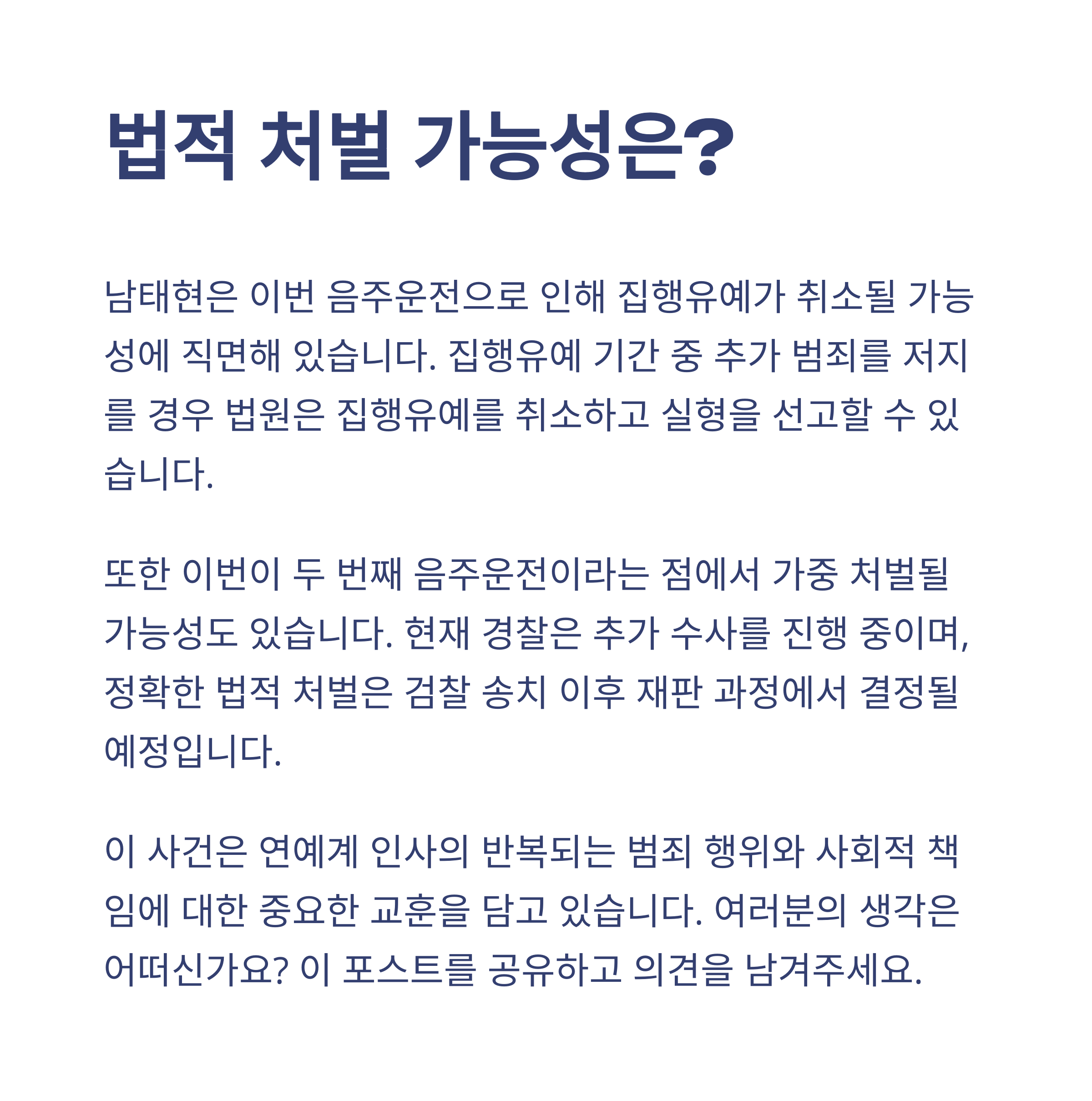 현재 남태현은 집행유예 기간 중 또다시 범죄를 저지른 상태입니다. 집행유예가 취소될 가능성이 매우 높으며, 그럴 경우 실형을 선고받게 될 수 있습니다. 특히 이번 음주운전이 두 번째라는 점에서 법원은 더욱 엄격한 판단을 내릴 수 있습니다.