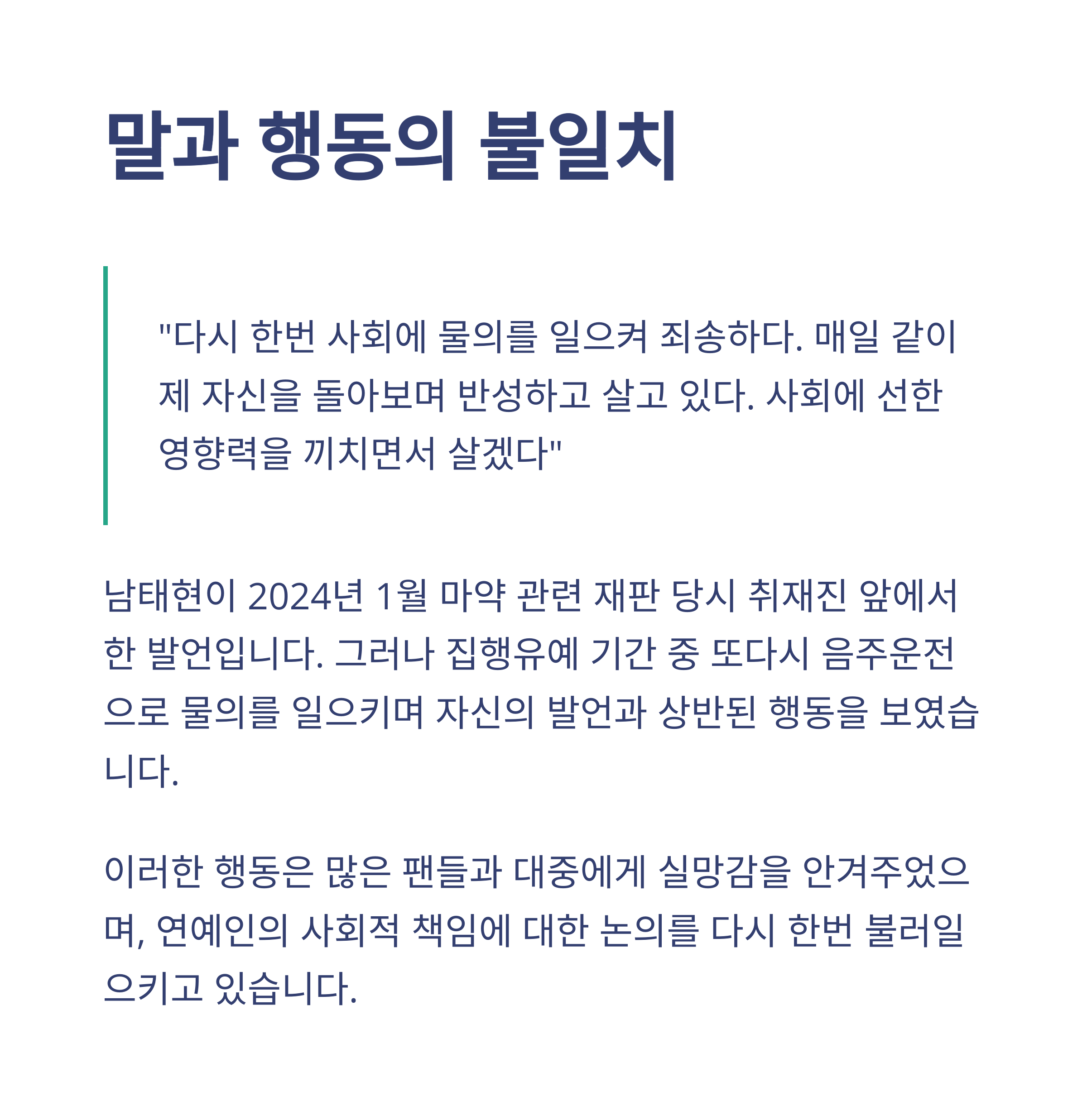 하지만 이번 남태현 음주운전 사건은 그러한 발언과는 전혀 어울리지 않는 행동이었습니다. 대중은 그의 말을 더 이상 신뢰하지 않으며, 일부 팬들조차 등을 돌리는 분위기입니다. 신뢰 회복은 더욱 어려워진 상황입니다.