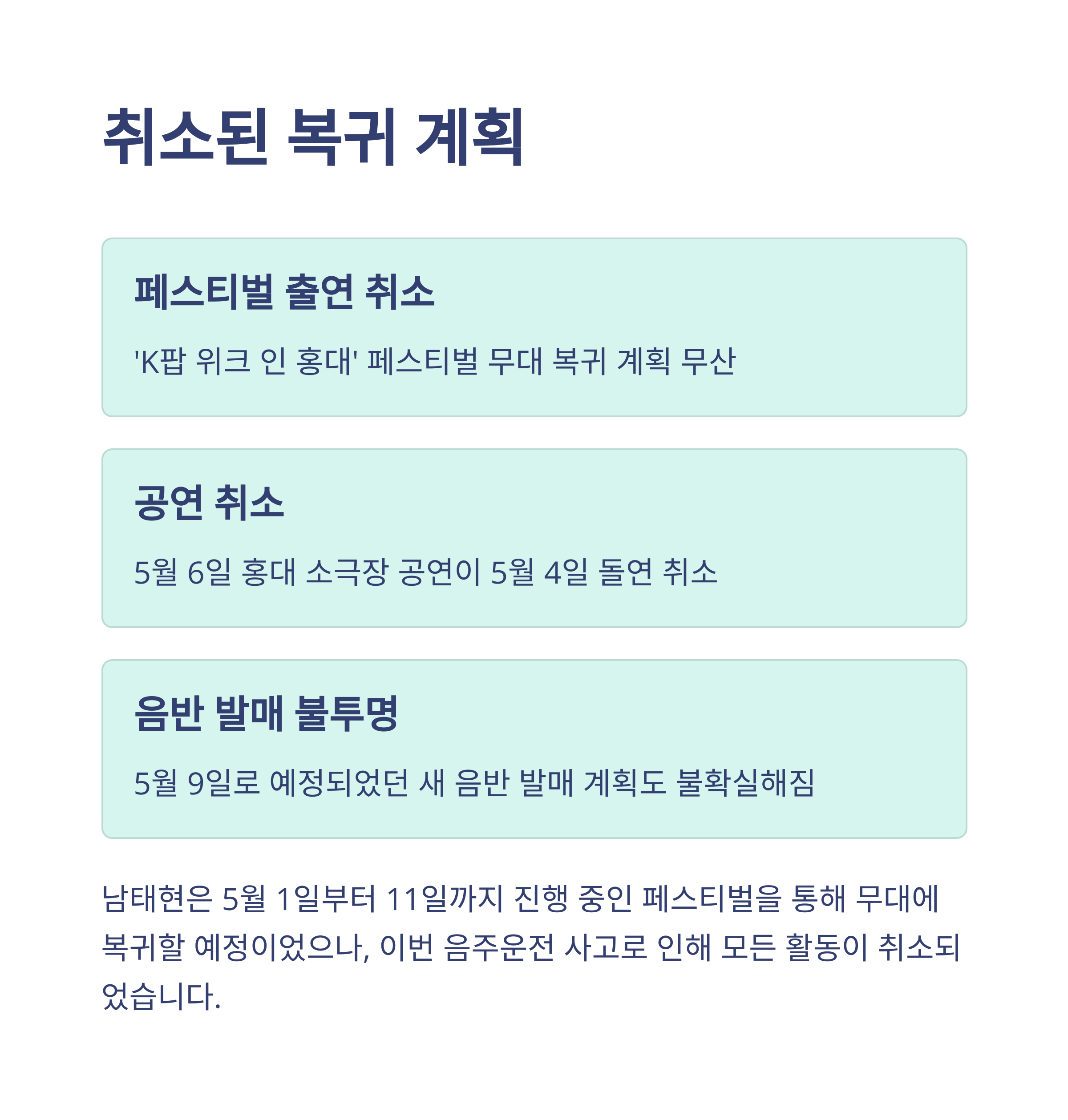 남태현 음주운전 입건 이후 그의 연예 활동도 차질을 빚고 있습니다. 2025년 5월 1일부터 11일까지 예정되어 있던 ‘K팝 위크 인 홍대’ 공연이 전격 취소되었습니다. 특히 5월 6일 열릴 예정이었던 무대는 사고 발생 직후인 4일에 취소 공지가 올라왔습니다.