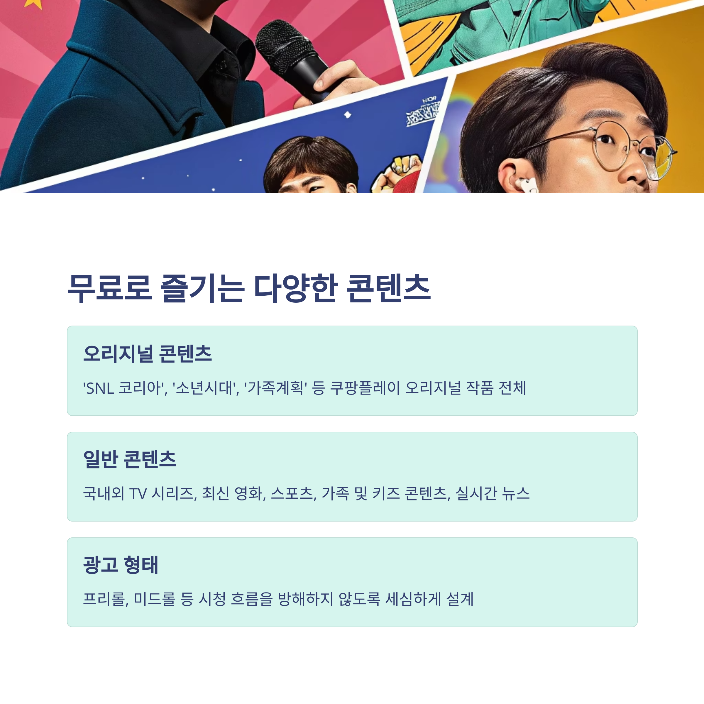 무료 회원에게도 쿠팡플레이의 오리지널 콘텐츠인 ‘SNL 코리아’, ‘소년시대’, ‘가족계획’ 등이 전부 개방됩니다. 뿐만 아니라, 국내외 드라마와 최신 영화, 스포츠 중계, 가족·키즈 콘텐츠, 뉴스 등 다양한 장르의 콘텐츠를 즐길 수 있습니다. 광고는 콘텐츠 시작 전(프리롤), 중간(미드롤) 등에 자연스럽게 삽입되며, 시청 흐름을 방해하지 않도록 설계되었어요. 이는 이용자의 몰입도를 최대한 해치지 않기 위한 전략이라고 할 수 있습니다.