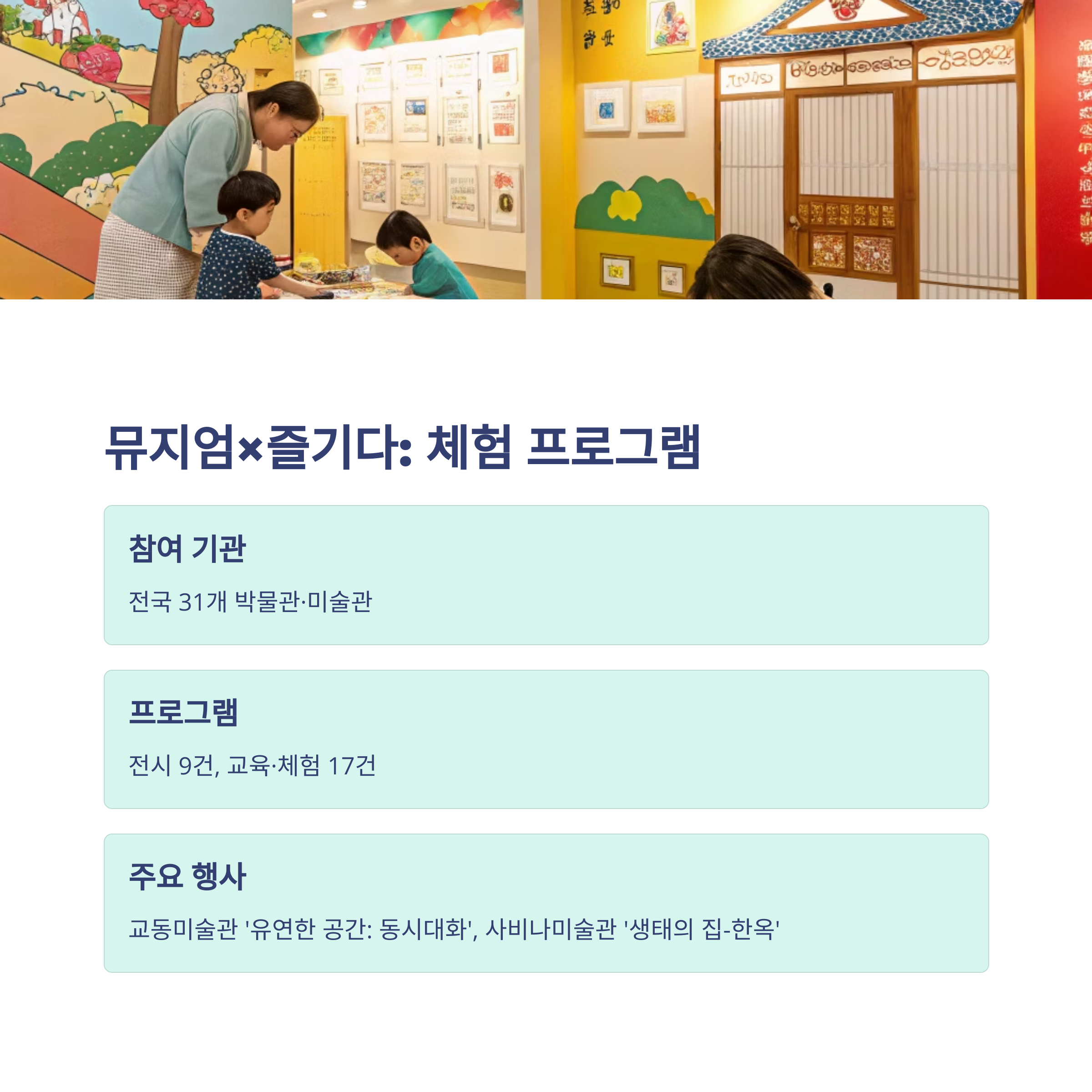 - 뮤지엄×즐기다: 전시 9건, 교육·체험 17건 등, 아이와 어른 모두 즐길 수 있는 체험 중심 행사들이 준비되어 있습니다.