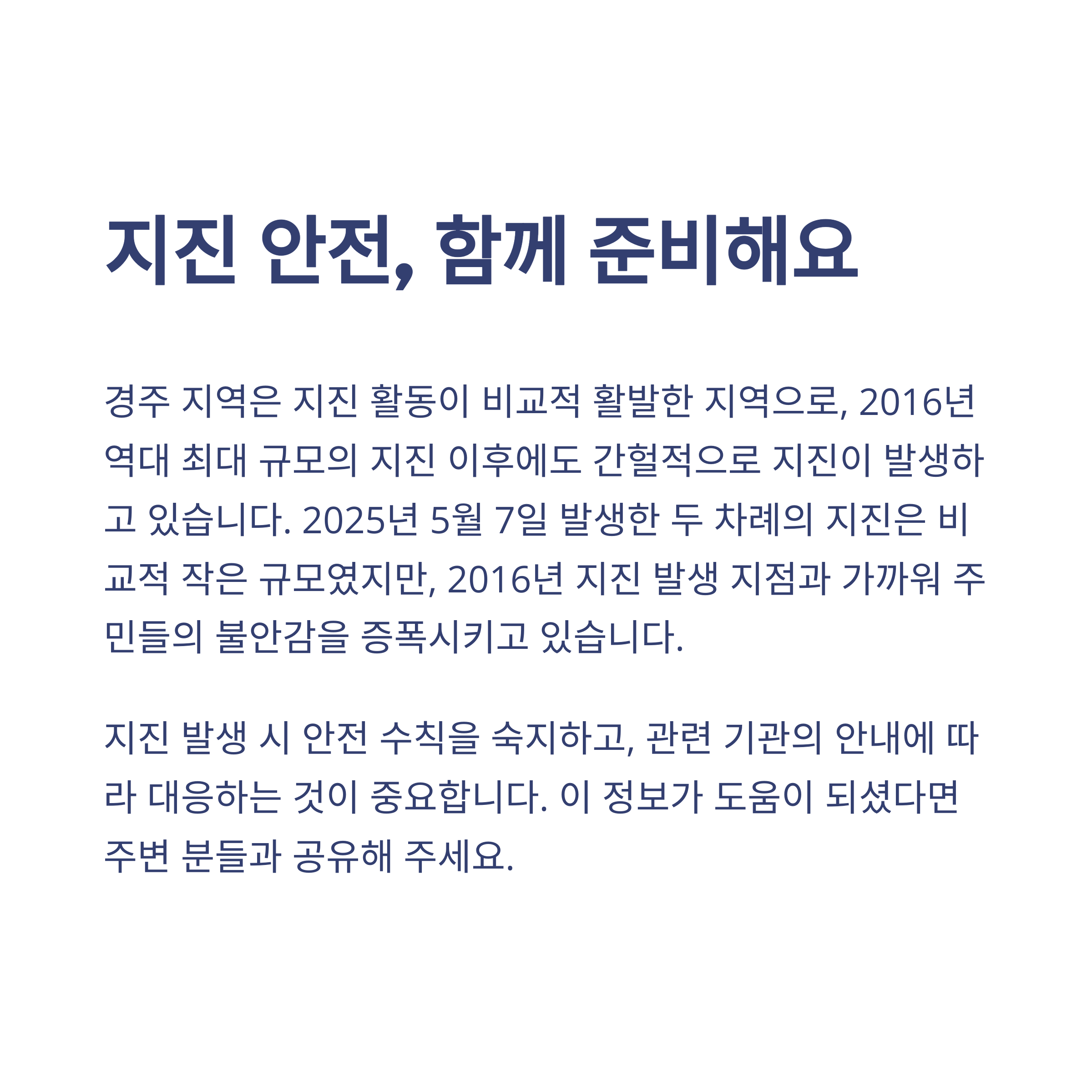 자연재해는 언제, 어디서든 우리를 시험할 수 있지만, 준비된 사람은 더 빠르게 안전을 확보할 수 있습니다. 이번 경주지진은 다행히 큰 피해 없이 지나갔지만, 이것이 끝이 아닐 수 있다는 사실을 기억해야 합니다.