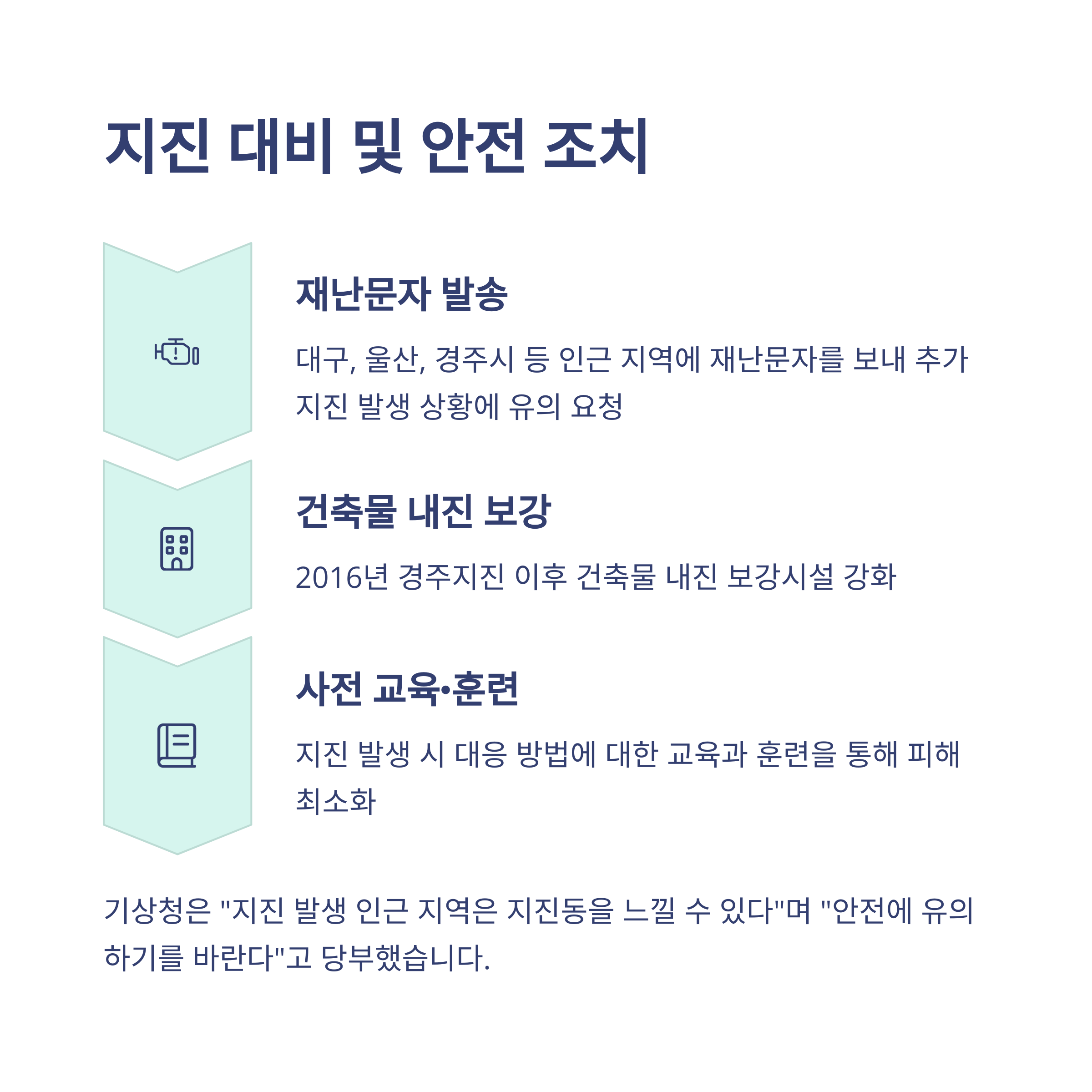 정부와 지자체는 내진 설계 기준을 강화하고, 지진 조기 경보 시스템과 대국민 대응 매뉴얼을 정비하며 대비 태세를 높였습니다.