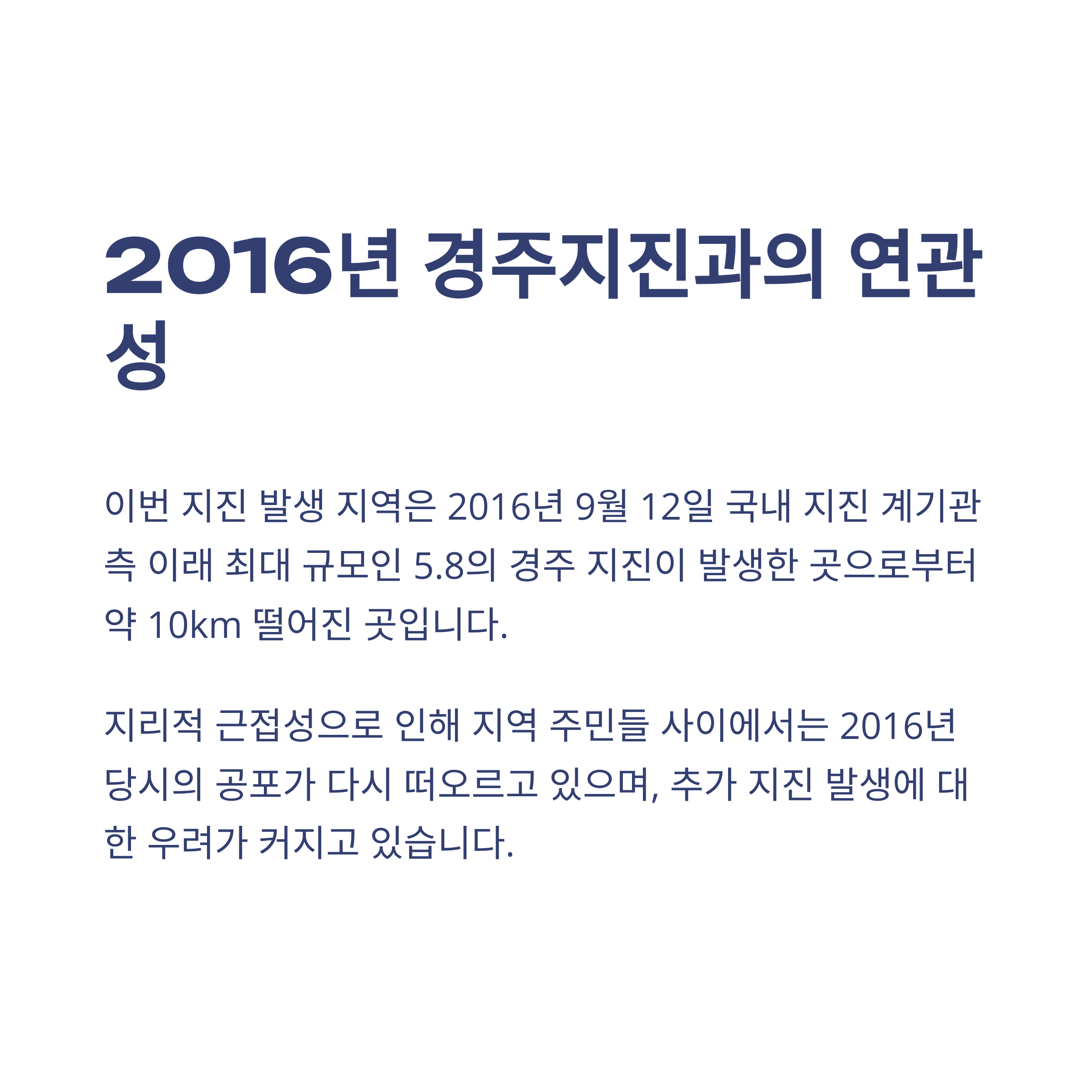 이번 지진의 발생 지점은 2016년 9월 12일 국내 최대 규모 지진이 발생했던 지점에서 약 10km 떨어진 곳입니다. 당시 경주지진은 규모 5.8로, 한반도 지진 관측 사상 가장 강력한 지진으로 기록되었습니다.